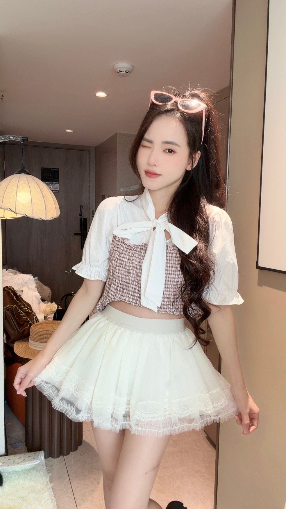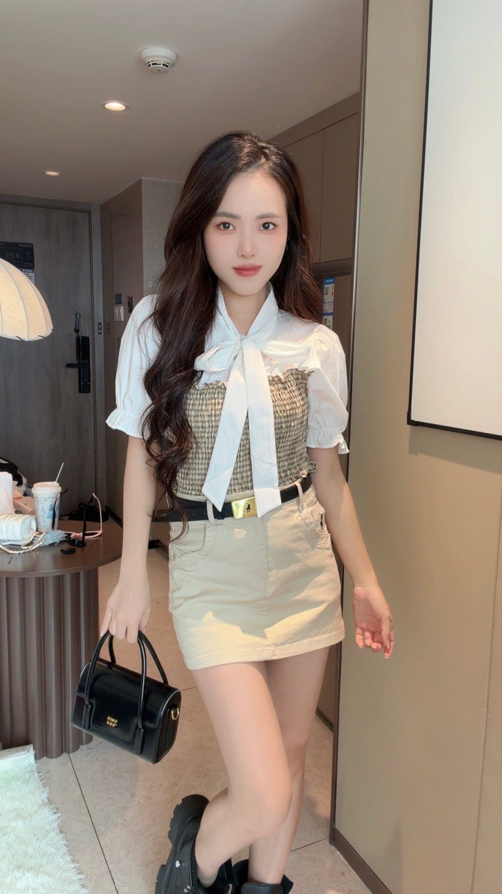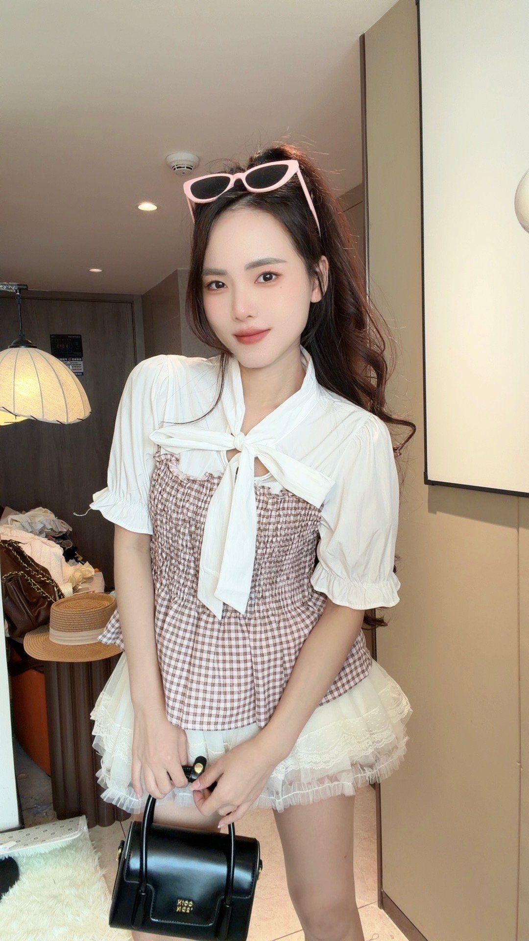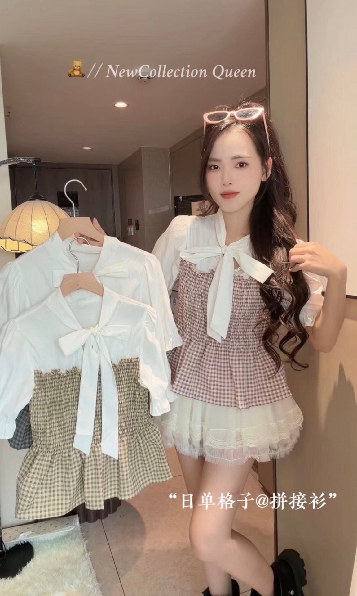 很甜美的一款呀 拼接格纹&系带设计🩷有弹力哟~