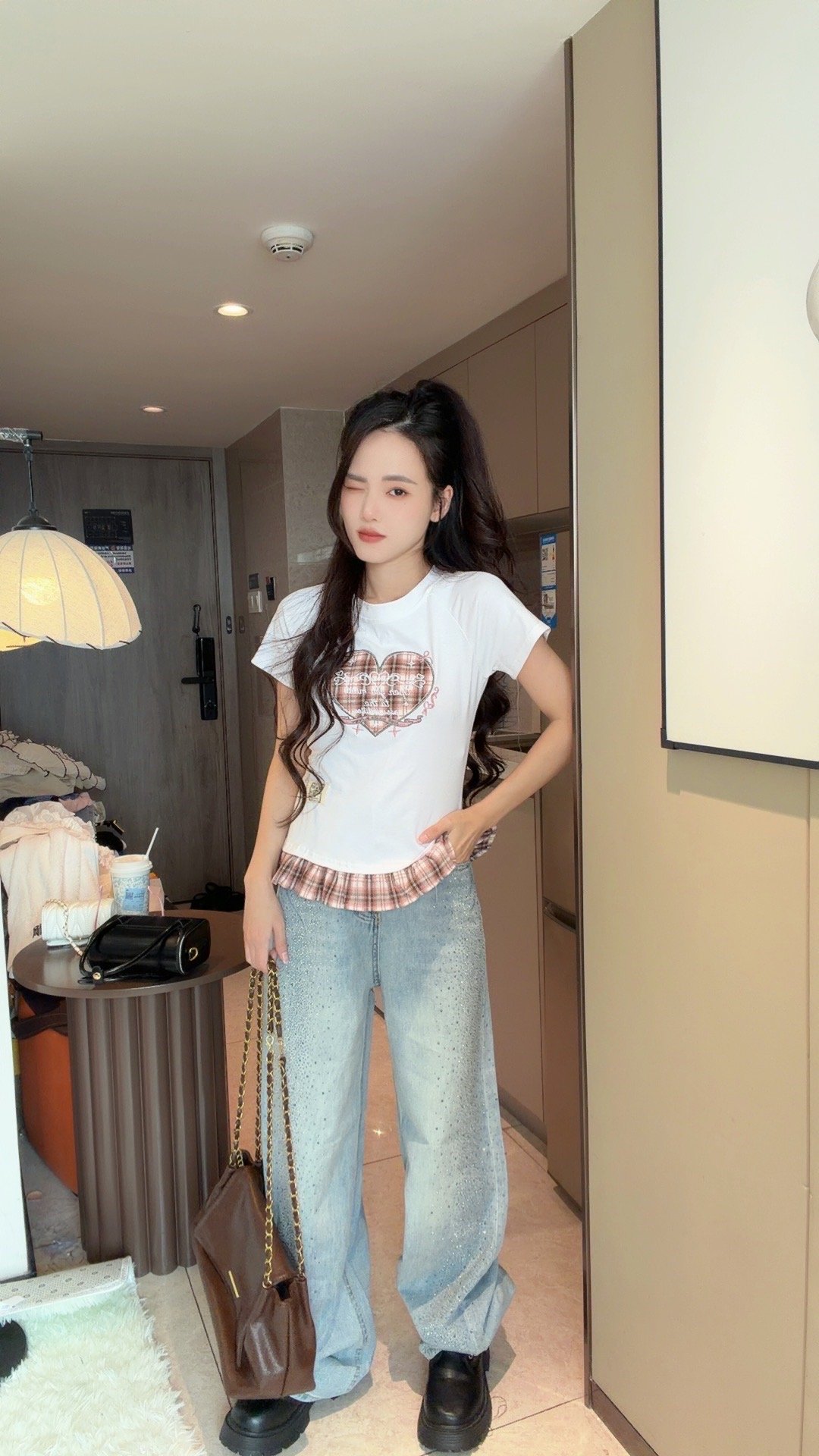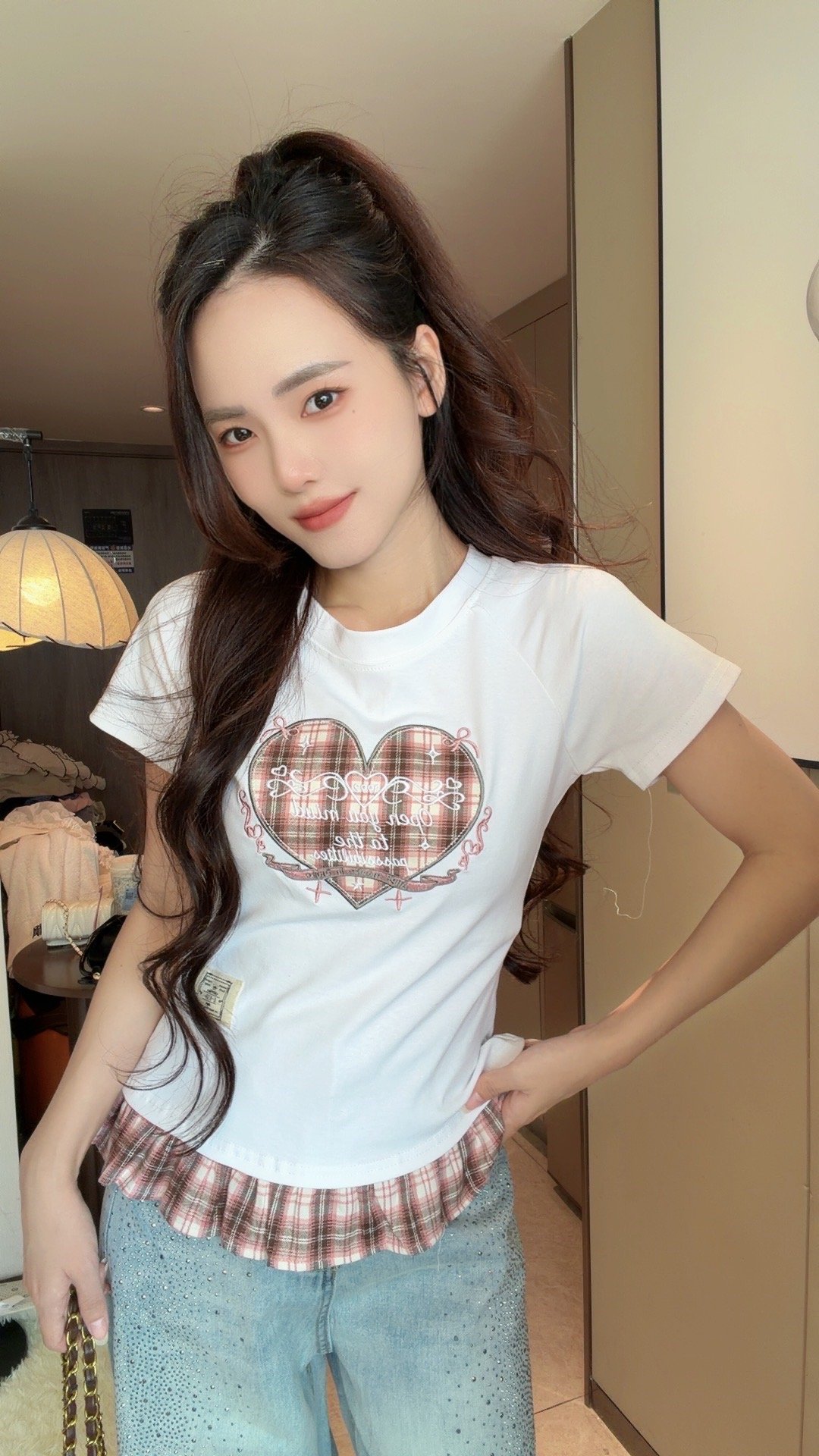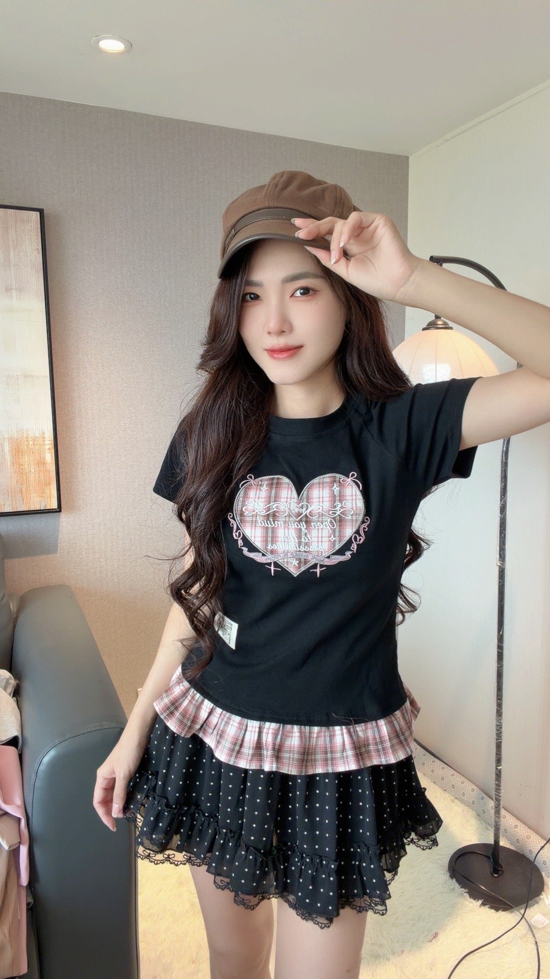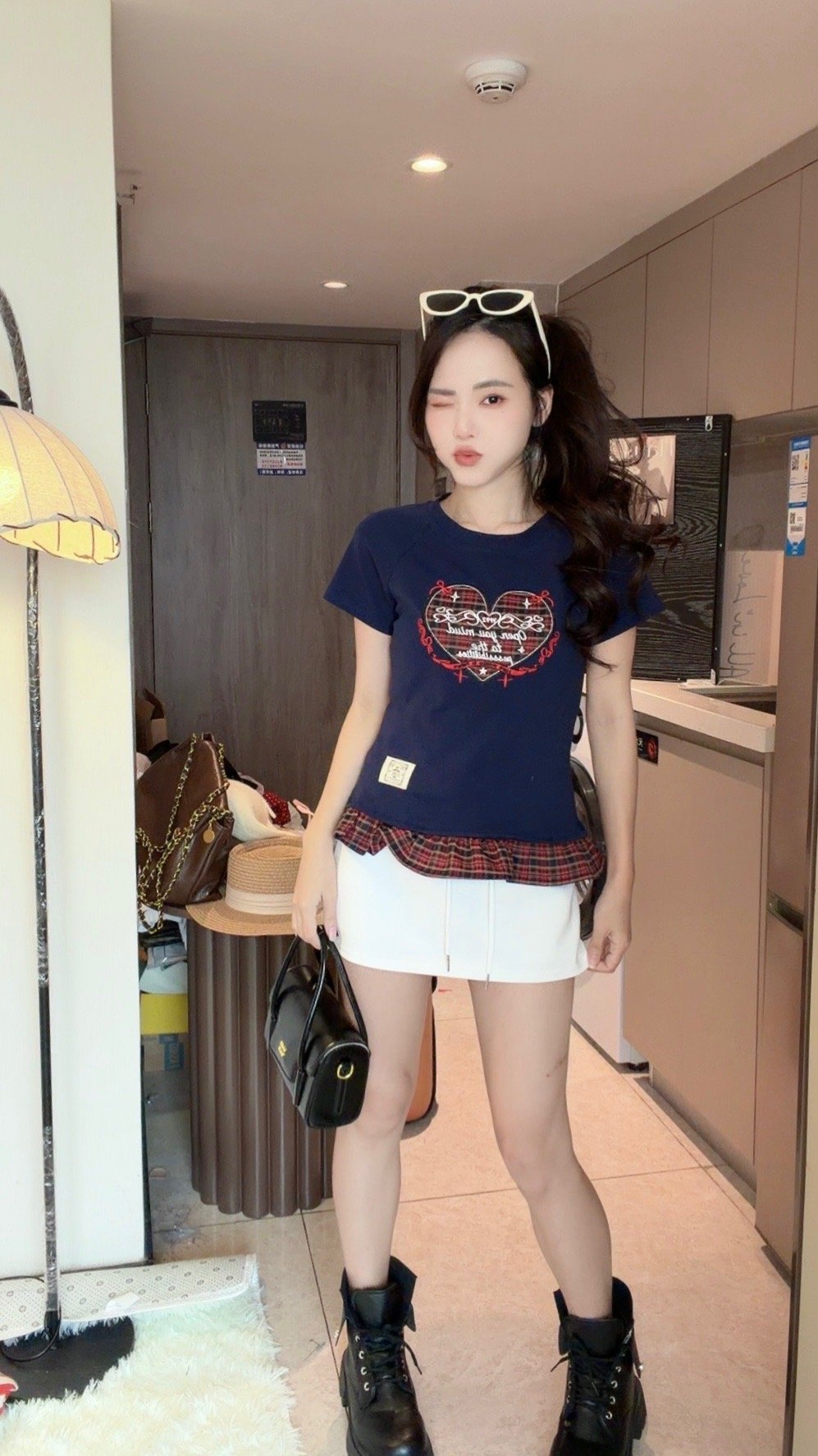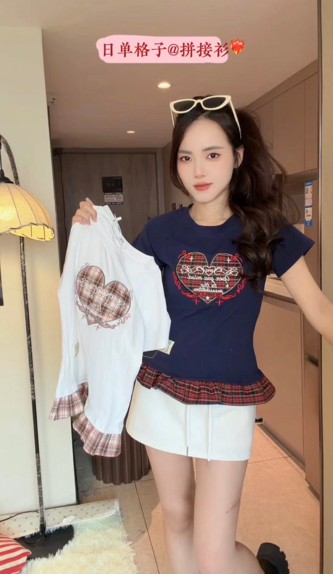 下摆拼接格纹设计 最吸睛的还是这个爱心💗搭配长裤/短裤都好看~