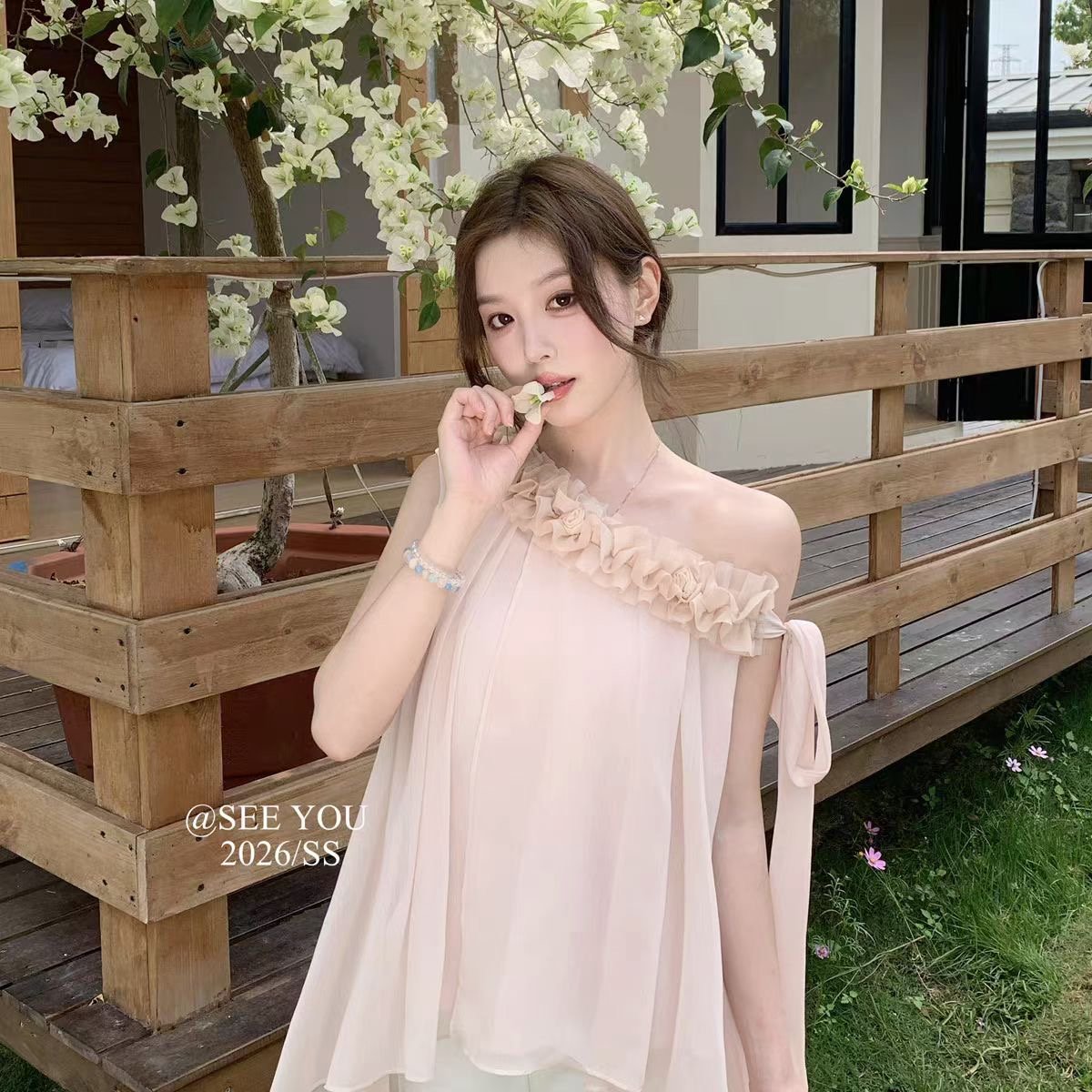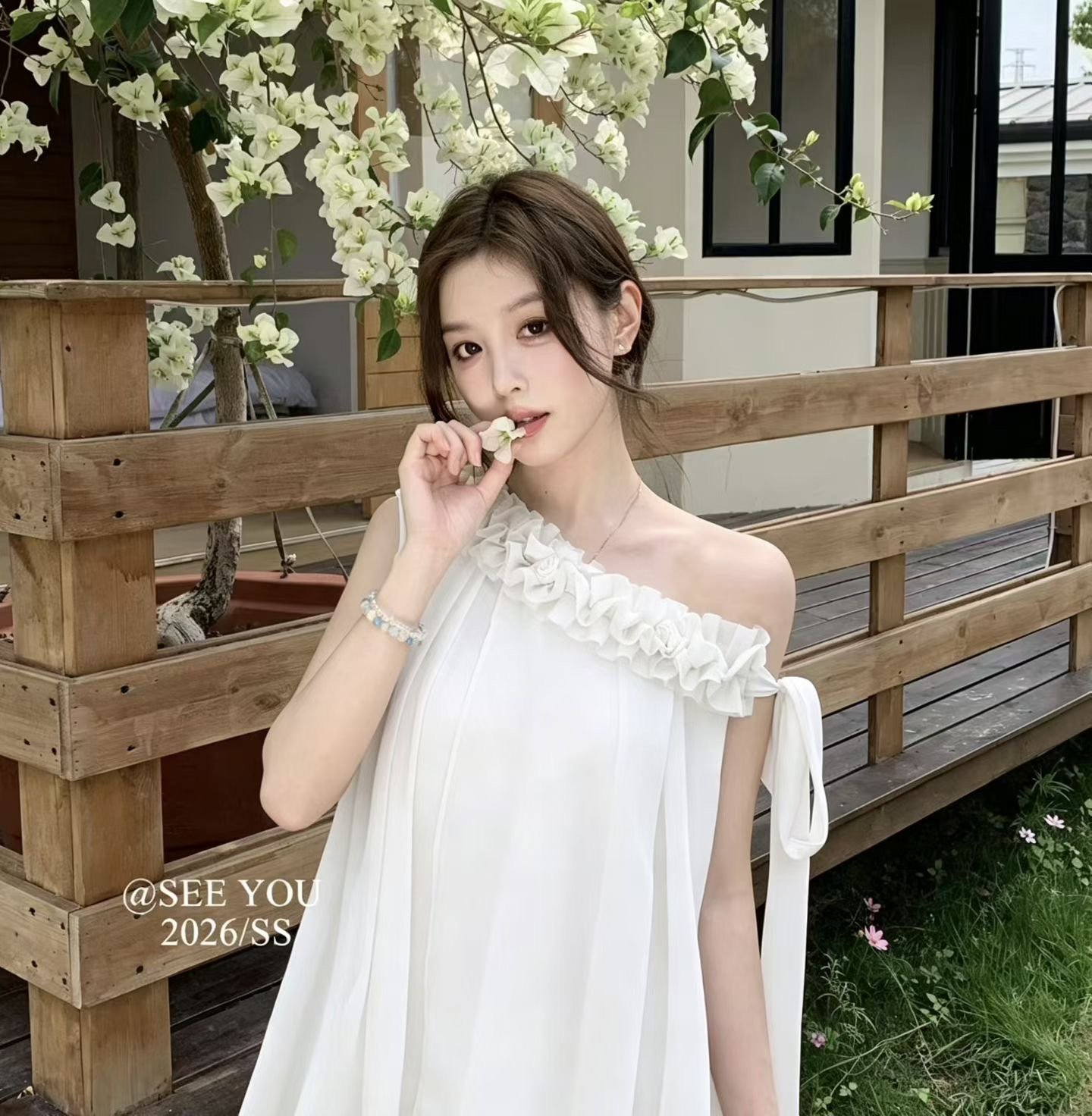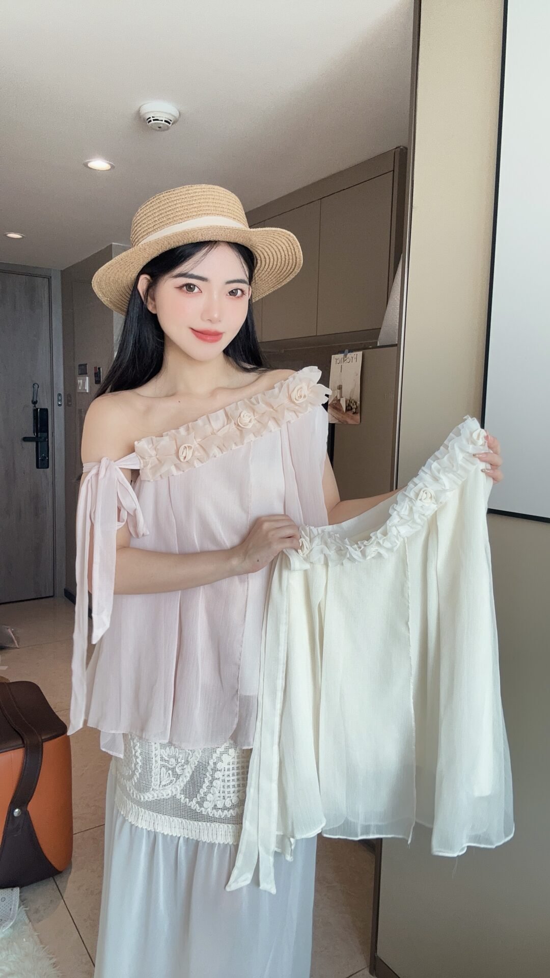 斜肩设计+立体花点缀🌸 卷边细节感、韩系氛围拉满~